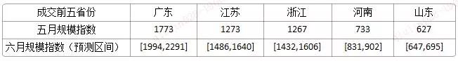 相較于五月份的規模指數,預測成交前五省的規模指數在六月份呈上升趨勢,其中,山東省增速較緩。