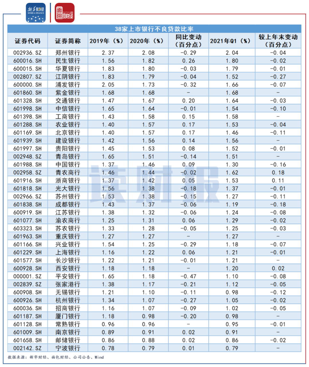 圖2:38家上市銀行2019-2021Q1不良貸款比率
