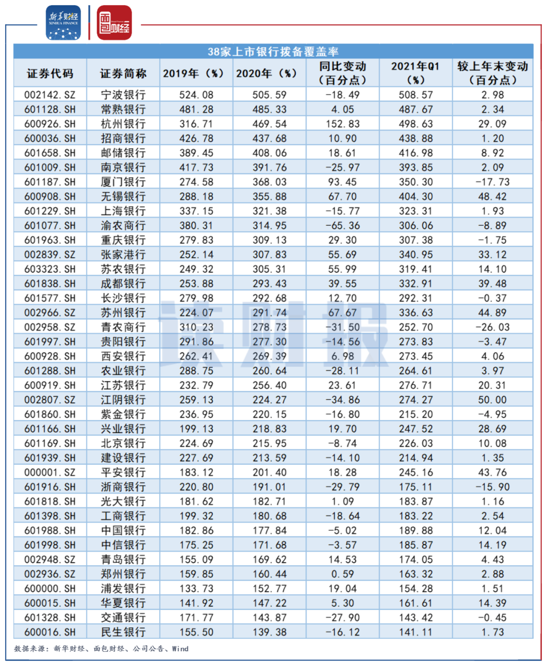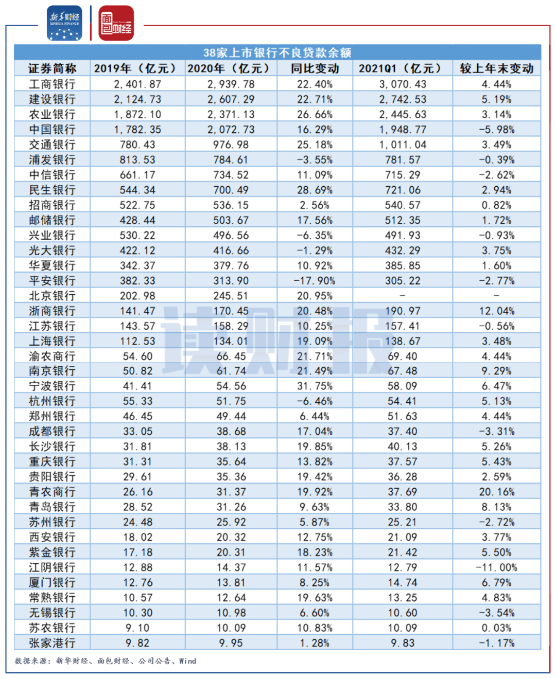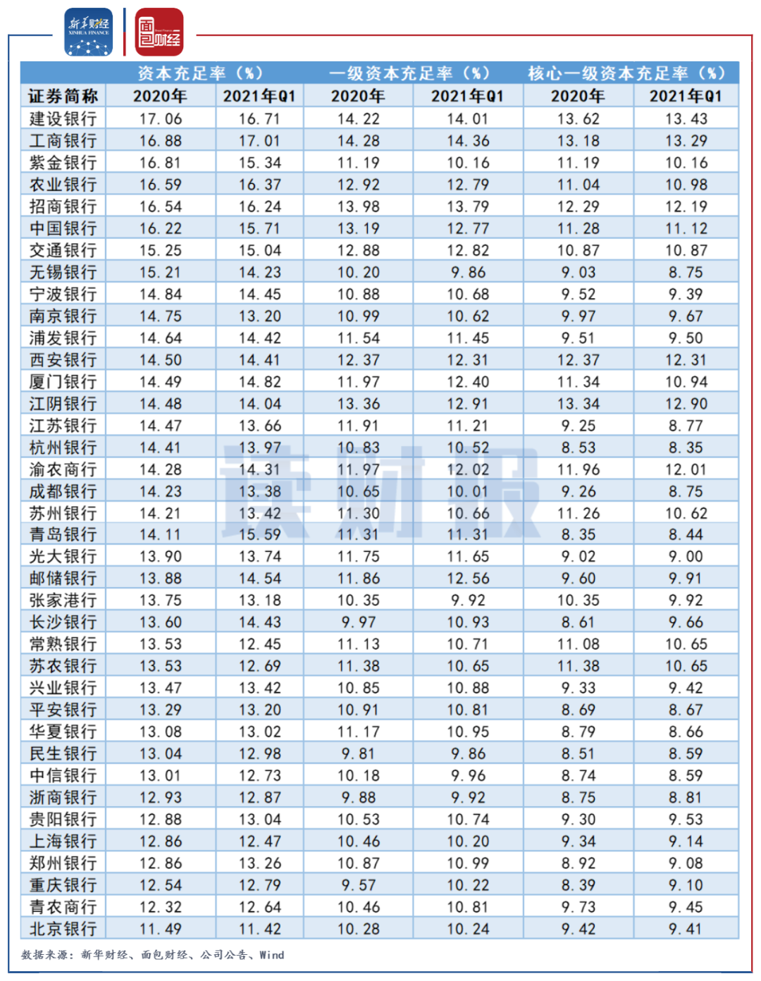 隨著2020年年報及2021年一季報披露結束,新華財經及面包財經研究員對A股38家上市銀行與資產質量有關的核心監管指標進行了整理。
