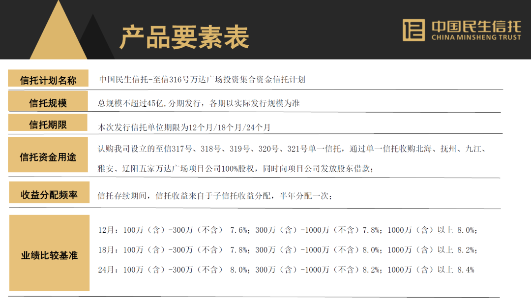 在產(chǎn)品推介要素表當(dāng)中,強(qiáng)調(diào)了該信托計(jì)劃的資金用于設(shè)立單一信托,收購(gòu)北海、撫州、九江、雅安和遼陽(yáng)五家萬(wàn)達(dá)廣場(chǎng)項(xiàng)目公司100%的股權(quán),同時(shí)向項(xiàng)目公司發(fā)放股東借款。