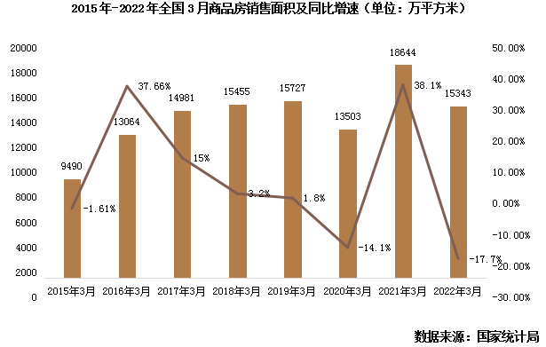 單月來看,商品房銷售面積15343萬平方米,同比下降17.7%;商品房銷售額14196億元,下降26.2%;二者降幅較1-2月擴大8.1pcts和6.9pcts。