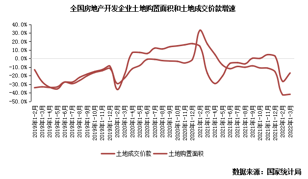 據國家統計局數據:1-3月,房地產開發企業土地購置面積1339萬平方米,比上年下降41.8%;土地成交價款672萬億元,下降16.9%。單月來看,3月土地購置面積和土地成交價款分別為501萬平方米和303億元,同比下降41%和1%。