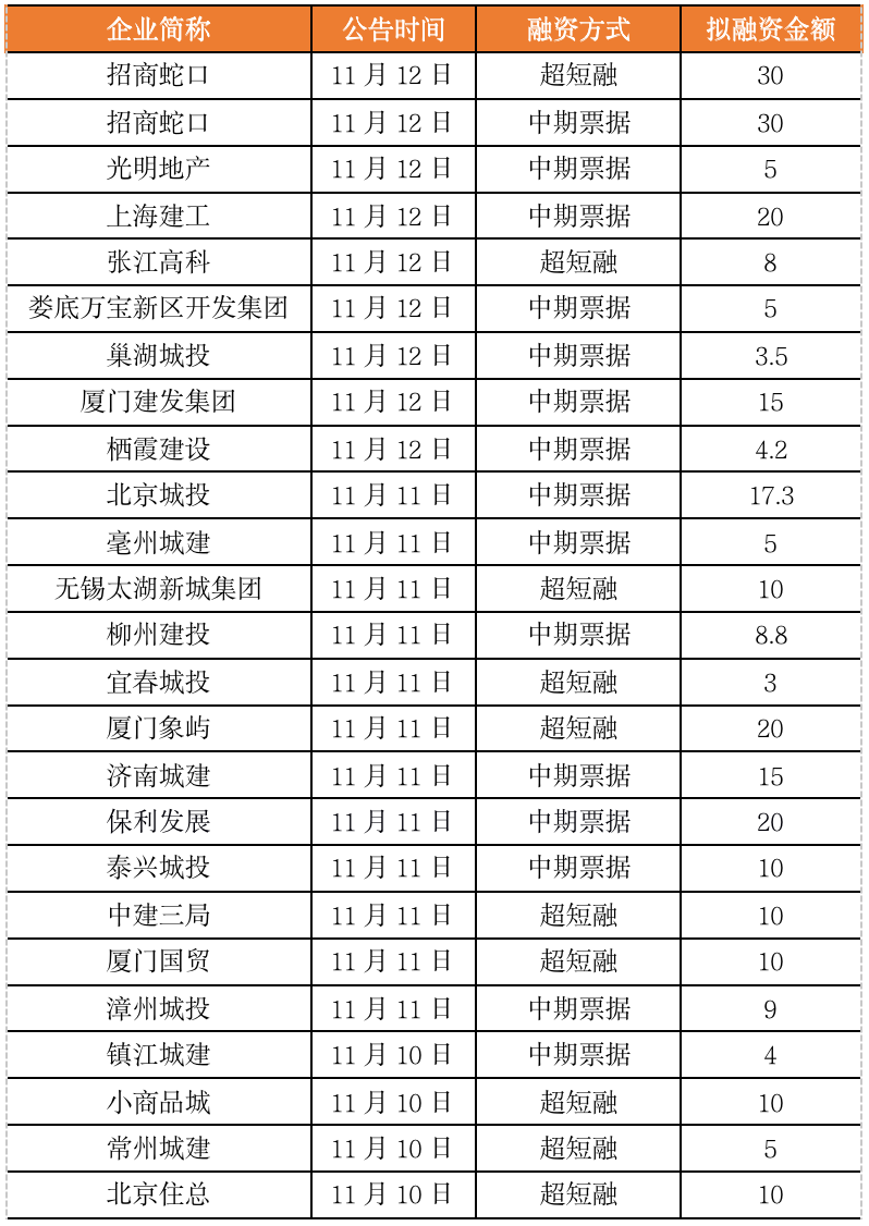 值得注意的是,11月11日,保利發(fā)展擬發(fā)行20億元中期票據(jù),將銀行間債券市場(chǎng)的融資主體從城投擴(kuò)展到主流房企,隨后,光明地產(chǎn)和招商蛇口等紛紛公告擬發(fā)行中期票據(jù)和超短融,企業(yè)融資“冰凍”狀態(tài)有所緩解。