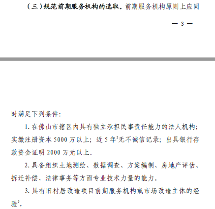 注意事項(xiàng):本部分主要內(nèi)容明確了前期工作內(nèi)容及選取方式等,其中尤為需要注意的是,本次新政對前期服務(wù)機(jī)構(gòu)設(shè)置了一定的硬性條件,如要求實(shí)繳注冊資本金5000萬以上,出具銀行存款資金證明2000萬以上,需要具有舊村居改造項(xiàng)目前期服務(wù)機(jī)構(gòu)或市場改造主體的經(jīng)驗(yàn)。