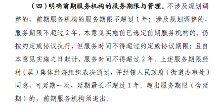 本部分內(nèi)容從四個(gè)方面進(jìn)行了明確:1、明晰前期工作內(nèi)容;2、確定前期工作組織模式;3、規(guī)范前期服務(wù)機(jī)構(gòu)的選?。?、明確前期服務(wù)機(jī)構(gòu)的服務(wù)期限與管理。
