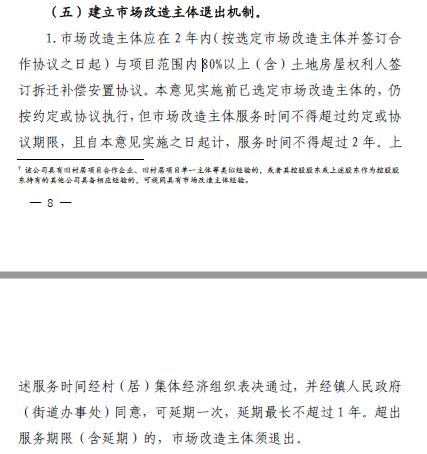 3、新政明確了市場改造主體的退出機(jī)制,建議:(1)嚴(yán)格按照政策要求期限,制定相關(guān)工作計(jì)劃;(2)項(xiàng)目拓展過程中,將該兩年內(nèi)與項(xiàng)目范圍內(nèi)80%以上土地權(quán)利人簽訂拆遷補(bǔ)償安置協(xié)議作為重大事項(xiàng)與合作方或平臺方進(jìn)行溝通,將該事項(xiàng)的完成作為主要的服務(wù)費(fèi)支付基礎(chǔ)或合作基礎(chǔ),嚴(yán)格設(shè)置完成期限并設(shè)置相應(yīng)的違約處理機(jī)制。