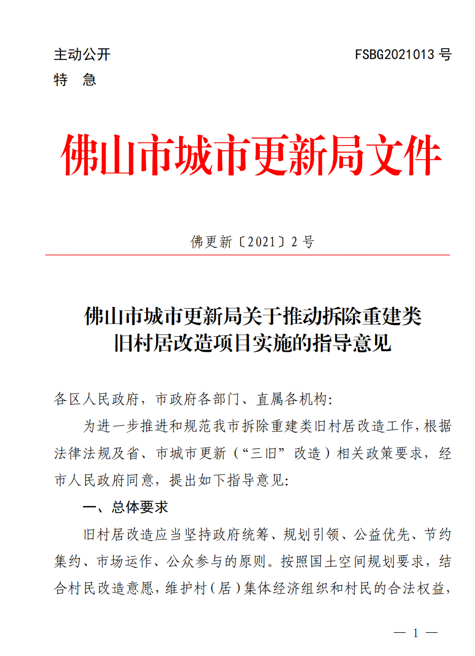 2021年3月2日,佛山市城市更新局主動公開并發(fā)布了《佛山市城市更新局關(guān)于推動拆除重建類舊村居改造項(xiàng)目實(shí)施的指導(dǎo)意見》(佛更新【2021】2號文)。