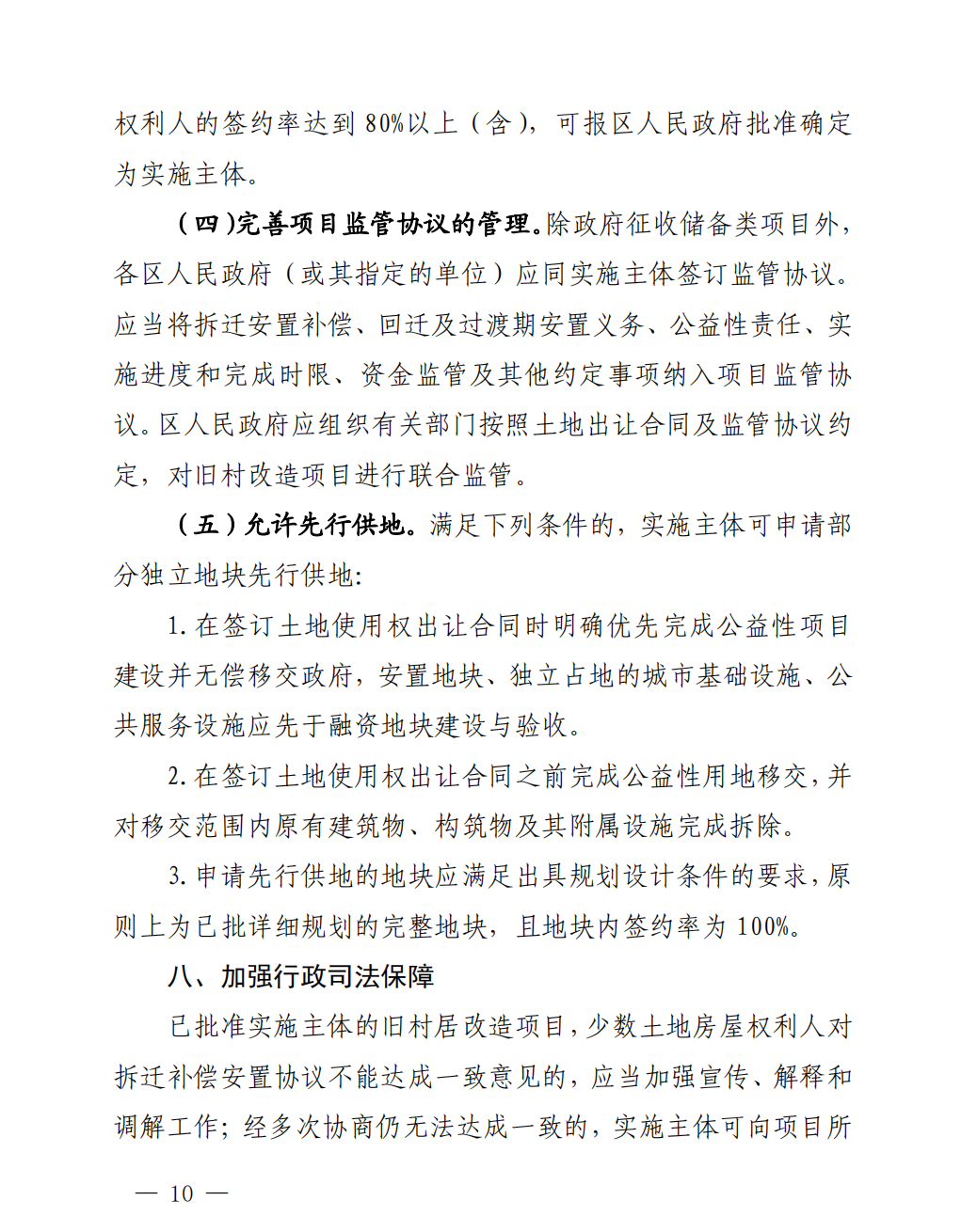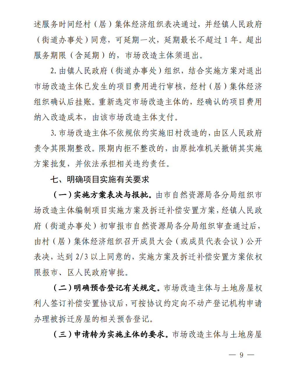 本部分內(nèi)容由五部分組成:1、實(shí)施方案表決與報(bào)批;2、明確預(yù)告登記有關(guān)規(guī)定;3、申請轉(zhuǎn)為實(shí)施主體的要求;4、完善項(xiàng)目監(jiān)管協(xié)議的管理;5、允許先行供地。