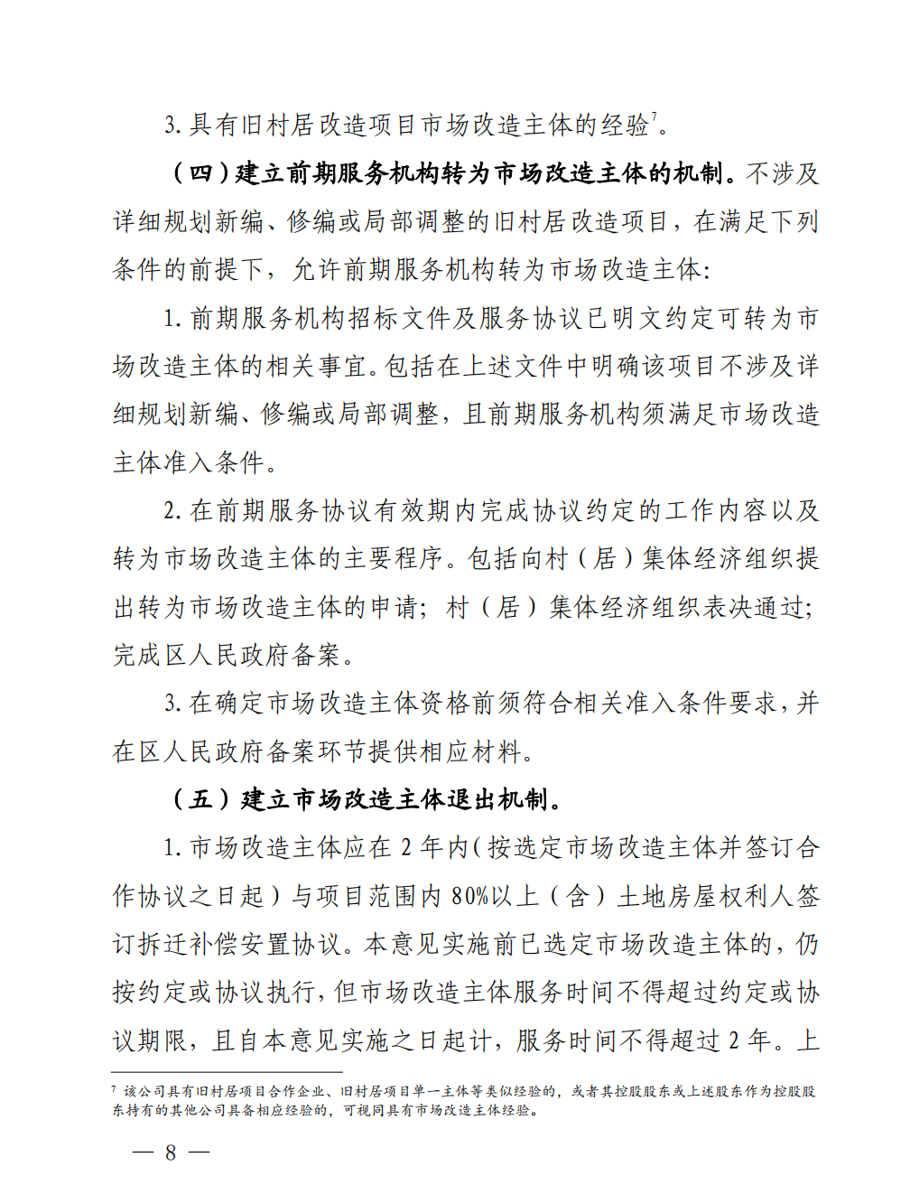 本部分內(nèi)容由五部分組成:1、規(guī)范市場改造主體的選??;2、加強(qiáng)市場改造主體招標(biāo)文件和改造協(xié)議管理;3、明確市場改造主體的準(zhǔn)入條件;4、建立前期服務(wù)機(jī)構(gòu)轉(zhuǎn)為改造市場主體的機(jī)制;5、建立市場改造主體的退出機(jī)制。
