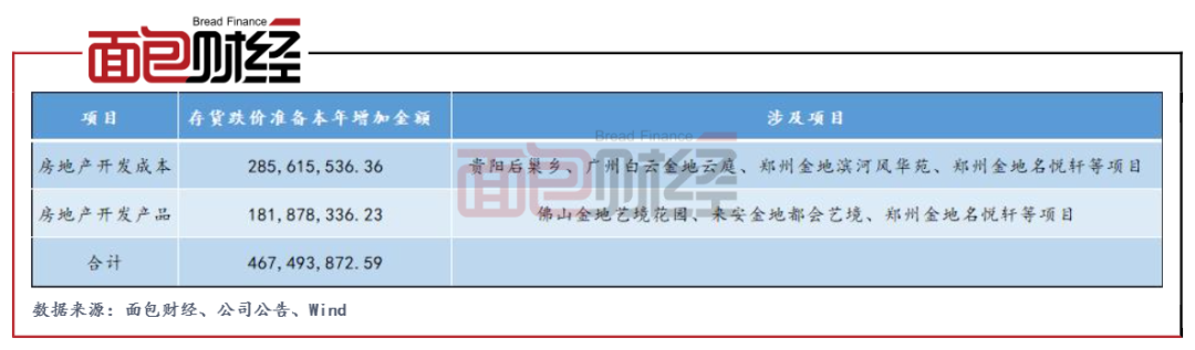 據披露,公司持有在建開發成本貴陽后巢鄉、廣州白云金地云庭、鄭州金地濱河風華苑、鄭州金地名悅軒等項目,因可變現凈值低于開發成本賬面金額,于當年末計提跌價準備約2.9億元;持有開發產品佛山金地藝境花園、來安金地都會藝境、鄭州金地名悅軒等項目,因可變現凈值低于開發成本賬面金額,于當年末計提跌價準備約1.8億元。