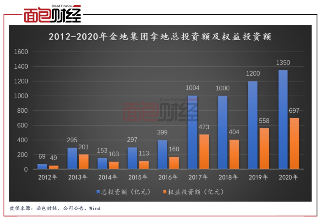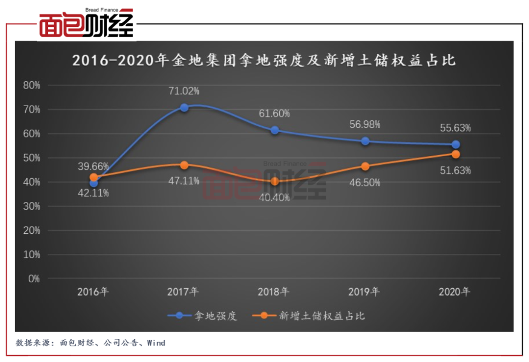 按照房地產行業的特性,結算毛利率相對來說是滯后的,從拿地毛利率兌現到結算毛利率,可能與融資成本、推盤節奏和結算結構有關。追溯金地集團過往拿地及銷售數據,自2016年開始,公司尋求銷售規模的快速增長,與之匹配的拿地儲備也全面加速。