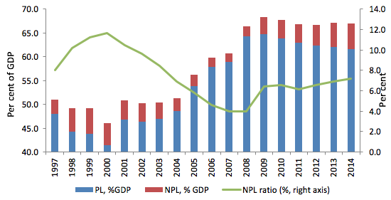 在金融危機(jī)時期,壞賬的增加是有問題的,但卻是可以預(yù)見的。目前情況的不同之處在于不良貸款的持續(xù)存在(例如,參見2016年國際貨幣基金組織的討論)。1997-98年亞洲金融危機(jī)之后,2000年以來,平均不良貸款率迅速下降;在2008-09年金融危機(jī)之后,平均不良貸款率穩(wěn)步上升(圖1)。