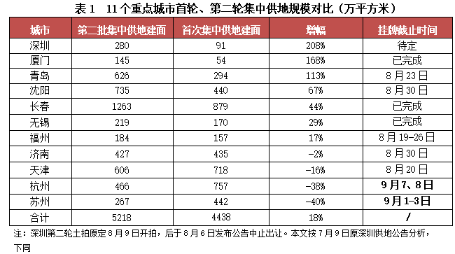 截止8月5日,22個重點城市中正式發布第二輪集中出讓公告城市已經過半(11城,其中長春、廈門已于6月拍完,無錫也于8月2日拍完),該輪集中供地11城總供應建面(僅統計涉宅地)達5218萬㎡,較首輪供應總建面增加了18%,供應規模明顯增加。