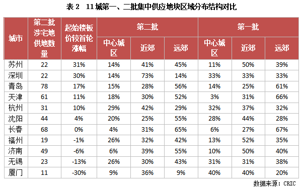 相比之下,廈門、無錫等城市供地質量整體有所下降,核心區供地比重有所下降。不僅如此,部分地塊出讓之時還增加了許多附加條件,以近日剛剛結束第二輪土拍的無錫為例,超半數地塊設置了額外門檻,如引進品牌酒店、配建人才房或租賃住房、現房銷售、自持商業等,這對房企也提出了更好的要求;加之無錫土拍本身實行“限地價+搖號”的競拍政策,因此無錫二輪集中土拍較首輪熱度明顯下降,平均溢價率4%,較首輪下降了8個百分點。