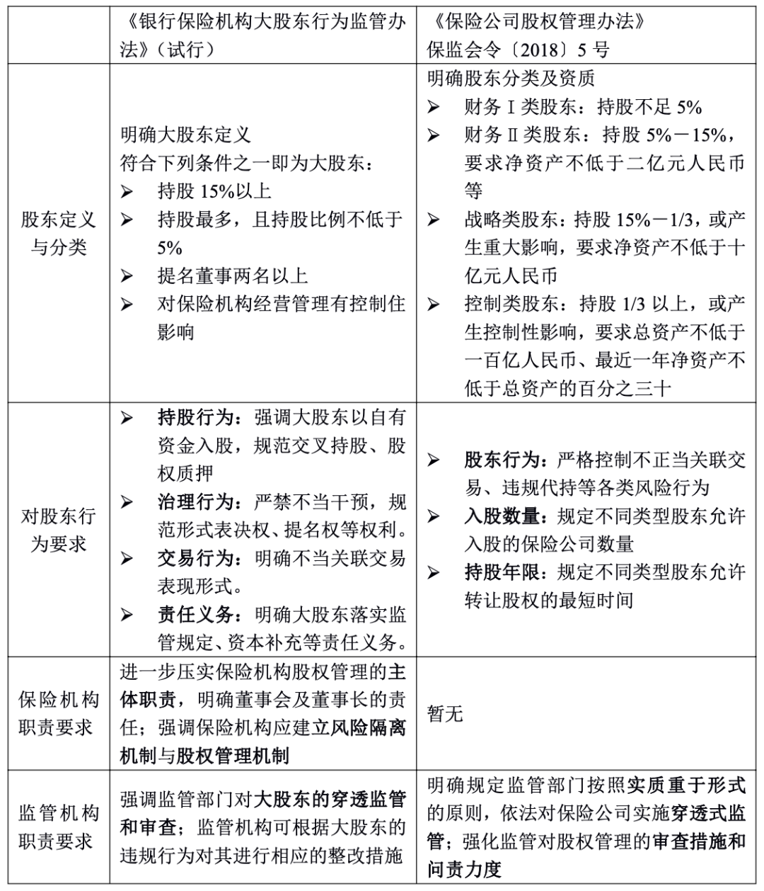 目前,對(duì)保險(xiǎn)公司股權(quán)管理及股東行為起約束作用的監(jiān)管規(guī)定主要是《大股東監(jiān)管辦法》和《股權(quán)管理辦法》。對(duì)比來(lái)看,《股權(quán)管理辦法》對(duì)保險(xiǎn)公司股東準(zhǔn)入、股權(quán)管理、關(guān)聯(lián)交易等作出相應(yīng)的監(jiān)管規(guī)定;《大股東監(jiān)管辦法》則重點(diǎn)從大股東角度出發(fā),明確其責(zé)任義務(wù),規(guī)范其股東行為,加強(qiáng)事中事后監(jiān)管,是對(duì)現(xiàn)有股權(quán)監(jiān)管制度的細(xì)化補(bǔ)充和完善統(tǒng)一。兩個(gè)制度的對(duì)比分析具體如下: