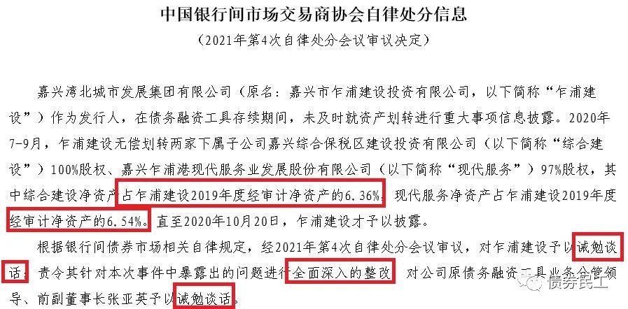 嘉興灣集團于2020年7-9月將兩家子公司(合計占2019年度凈資產超過10%)的股權無償劃轉,資產無償劃轉事宜披露不及時。交易商協會對嘉興灣集團處以誡勉談話、全面深入整改的自律處分。