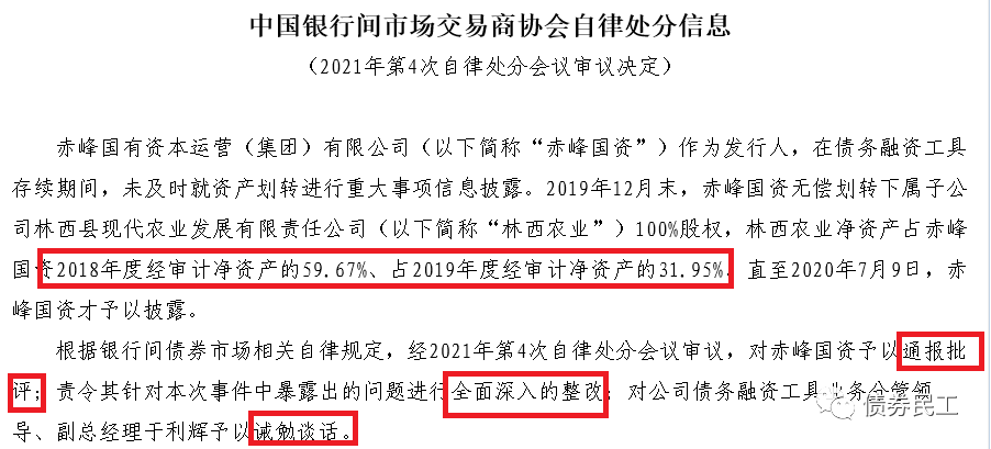 赤峰國資于2019年12月末將子公司(占2019年度凈資產的31.95%)的股權無償劃轉,資產無償劃轉事宜披露不及時。交易商協會對赤峰國資處以通報批評、全面深入整改和誡勉談話的自律處分。