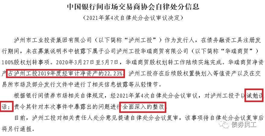 瀘州工投于2020年3-5月將子公司(合計占2019年度凈資產的22.23%)的股權無償劃轉,資產無償劃轉事宜披露不及時。交易商協會對瀘州工投處以誡勉談話、全面深入整改的自律處分。需要特別關注的是,瀘州工投已對自律處分提出了復審,結果有待進一步確認。