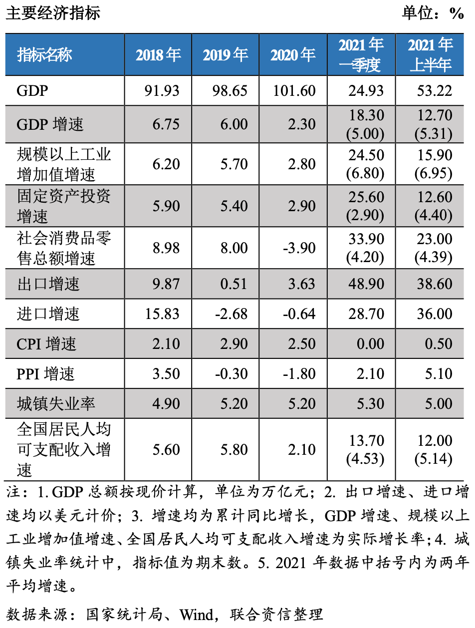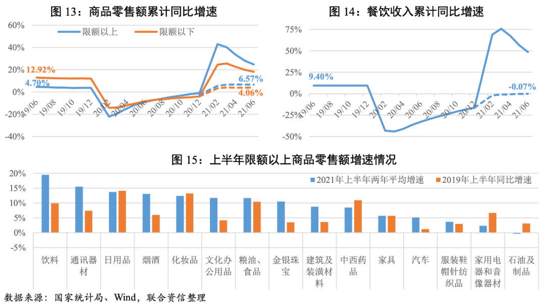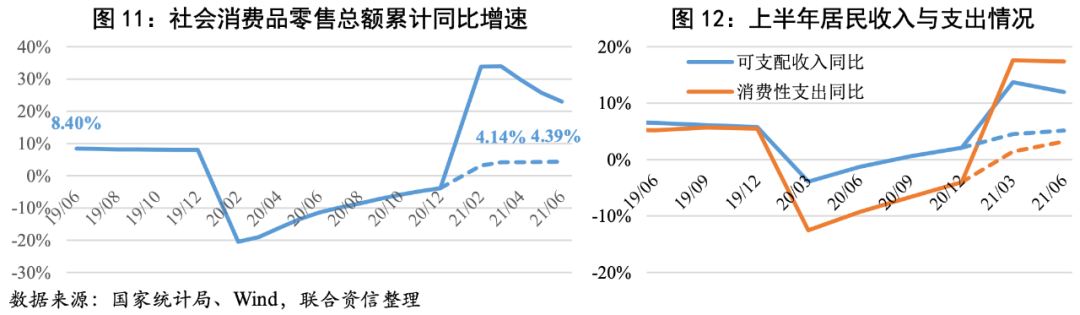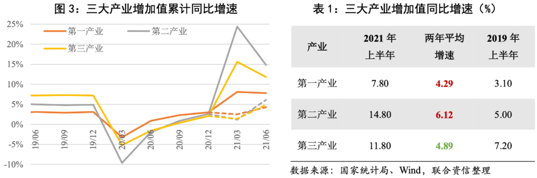 ·2021年上半年,我國國內生產總值53.22萬億元,同比增長12.70%,兩年平均增長5.31%,低于2019年上半年水平。三大需求中消費拉動弱于疫情前水平是GDP增速的主要制約。