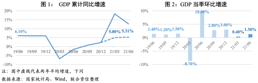 經濟穩定修復。2021年上半年,我國國內生產總值53.22萬億元,不變價累計同比增長12.70%,兩年平均增長5.31%,較一季度加快0.31個百分點,低于2019年上半年水平。消費拉動弱于疫情前水平是GDP增速的主要制約:從兩年平均來看,上半年消費雖然是拉動經濟增長的主引擎,但對GDP的拉動仍低于疫情前水平,是上半年GDP兩年平均增速不及2019年同期的主要原因。從環比來看,二季度環比增長1.30%,較一季度明顯加快,與2019年水平相近,二季度經濟平穩修復。
