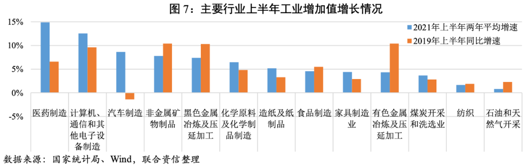 從主要行業工業增加值兩年平均增速來看,醫藥制造業、計算機、通信和其他電子設備制造業以及汽車制造業較2019年同期有較大提升,主要是出口帶動;而黑色、有色金屬冶煉及延壓加工業和非金屬礦物制品業較2019年下降較大,或是由于我國碳達峰工作的推進以及環保限產措施的實施,導致鋼鐵、有色和水泥行業產能擴展空間有限。