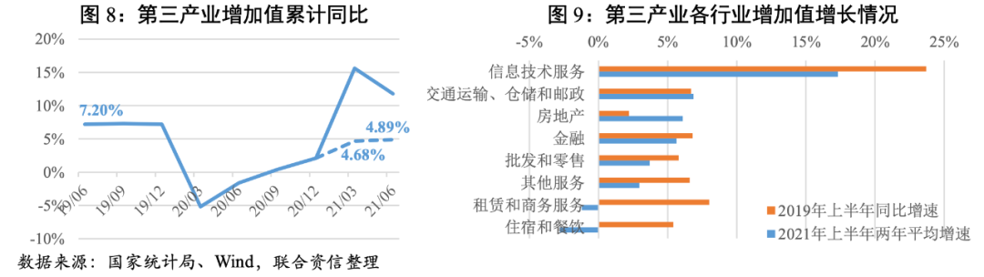 ·上半年工業生產較快增長,由于碳達峰工作的推進以及環保限產措施的實施,鋼鐵、有色和水泥等部分行業產能擴張空間有限。服務業仍未回到疫情前水平,且恢復空間仍然較大,住宿和餐飲、租賃和商務服務業拖累明顯。