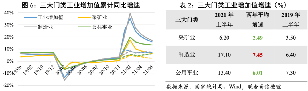 分三大門類看,制造業工業增加值增長最快,兩年平均增長超過疫情前正常水平,繼續發揮支撐工業穩定增長的重要作用;采礦業和電力、熱力、燃氣及水生產和供應業(公共事業)兩年平均增長低于疫情前正常水平。