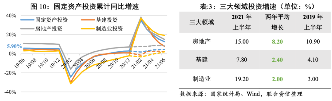 上半年投資三大領域依舊呈現“房地產>基建>制造業”的格局,三大領域兩年平均增長均未達到疫情前水平。其中上半年房地產開發投資是固定投資的主要支撐,但出現邊際減弱的趨勢,“三條紅線”、“限貸令”以及部分地區出臺的限售、限貸政策效果開始顯現;上半年基建投資低位運行,主要是受到上半年專項債推遲發行、財政資金支出緩慢的影響;上半年制造業投資兩年平均增速逐月提升態勢明顯,在信貸政策支持、產能利用率處于高位、效益不斷改善等有利于制造業投資恢復的多方面因素的支撐下,制造業投資加速修復。