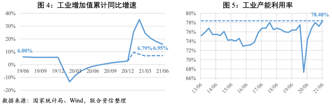 工業方面,2021年上半年,全國規模以上工業增加值同比增長15.90%,兩年平均增長6.95%,較一季度加快0.16個百分點,高于疫情前同期水平,月度環比保持在0.50%~0.70%之間,工業生產穩中加固。工業企業產能利用率處于高位。一、二季度全國工業產能利用率均處于2013年以來同期較高水平,企業設備閑置的成本壓力有所緩解。