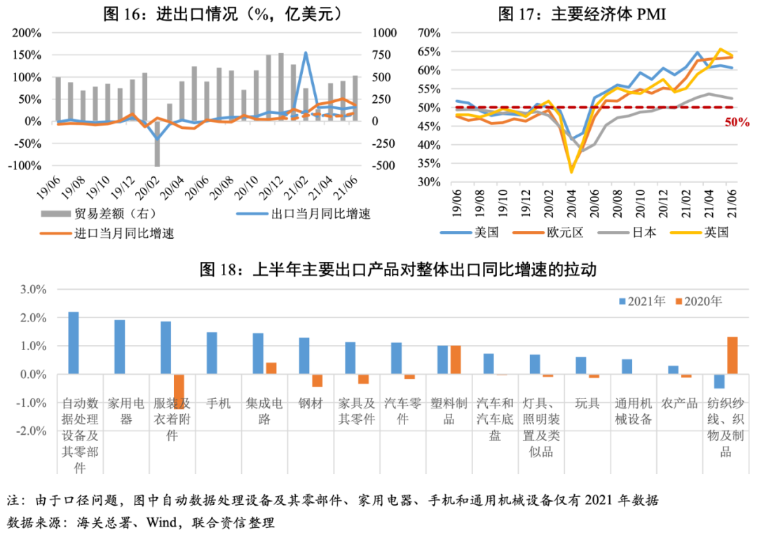 海外產需缺口支撐我國出口增長。2021年上半年主要經濟體PMI顯著上升,全球經濟恢復態勢良好,海外需求旺盛但產需依然存在較大缺口使得我國出口維持高景氣度。但海運領域出現的集裝箱運力緊張、運價高漲問題對出口產生一定的負面影響。從主要出口產品對整體出口同比增速的拉動來看,自動數據處理設備及其零部件、家用電器和服裝及衣著附件對出口增速的拉動較高;紡織紗線、織物及制品從上年同期的主要拉動轉變為主要拖累。主要出口商品拉動格局的變化反映出隨著疫情影響逐漸減弱,今年上半年以計算機、家用電器、手機等“宅經濟”耐用消費品代替防疫物資,成為拉動出口增長的重要動力。