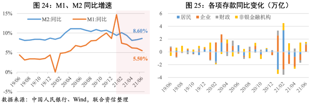 上半年M1同比增速持續回落,M2同比增速先降后升。二季度以來M2-M1剪刀差繼續走闊,主要是于房地產銷售降溫、原材料價格上漲造成企業現金流壓力使得M1增速下行所致。此外,上半年財政存款同比多增5015億元,財政支出力度不及上年同期,拖累了M2的增長。