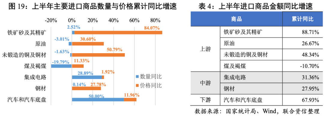 需求方面,上半年固定投資持續修復,其中房地產投資是固定投資的主要支撐、但出現邊際減弱的趨勢,基建低位運行,制造業投資加速修復;消費市場溫和復蘇,與疫情前水平仍有一定差距,餐飲等接觸型消費受疫情反復影響仍處于收縮區間,受缺芯等影響二季度以來汽車銷售增速有所放緩,尤其是6月增速回落顯著,消費市場復蘇基礎仍有待加強;上半年進出口規模創歷史同期最高水平,海外產需缺口支撐出口增長,國際大宗商品漲價、人民幣升值等多重因素使得進口金額快速增長。
