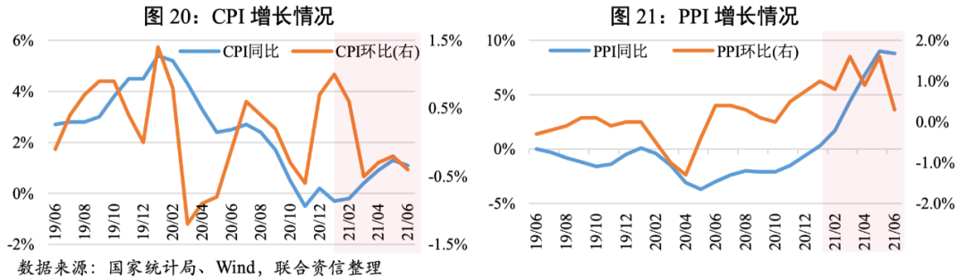 CPI方面,預計年內CPI整體溫和上漲。食品方面,夏糧豐收使得糧食價格有望繼續保持穩定;豬肉價格在中央和地方啟動豬肉儲備收儲工作下有一定的支撐,豬肉價格有望保持穩定態勢。食品價格在糧食豐收、豬肉價格保持穩定的情況下,總體上漲壓力不大。服務價格方面,今年上半年服務價格持續受到局部疫情反復的影響,目前處于近年來的低位。隨著疫苗接種范圍不斷擴大,疫情影響不斷減弱,餐飲、住宿、旅游的等服務消費需求持續恢復,居民服務性消費支出不斷改善,服務價格或將小幅回升。