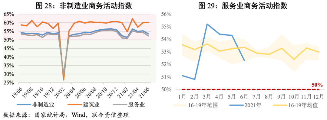 2021年上半年非制造業商務活動指數呈現下行趨勢,整體均處于榮枯線以上。6月非制造業商務活動指數為53.50%,低于上月1.70個百分點,非制造業擴張力度有所減弱。其中,服務業商務活動指數高位回落,但仍位于擴張區間,主要是受局部地區疫情反復等因素的短期影響;建筑業在高位景氣區間平穩運行。