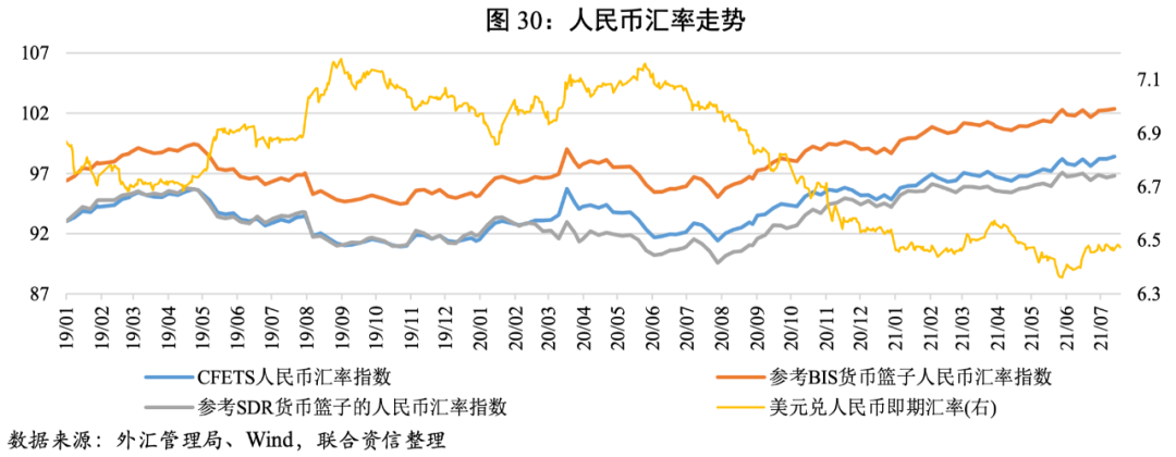 截至2021年6月末,我國外匯儲備規模為3.21萬億美元,較5月末小幅下降78億美元,外匯儲備規模保持基本穩定。2021年上半年美元兌人民幣經歷了“貶值-升值-貶值”的波動,5月31日央行宣布上調外匯存款準備金率后,6月人民幣兌美元扭轉了二季度以來的升值趨勢,但人民幣三大匯率指數上半年一直處于升值的趨勢,表明人民幣較為堅挺,主要是由于我國疫情相對較為穩定,經濟增長領先其他經濟體,風險相對較小。