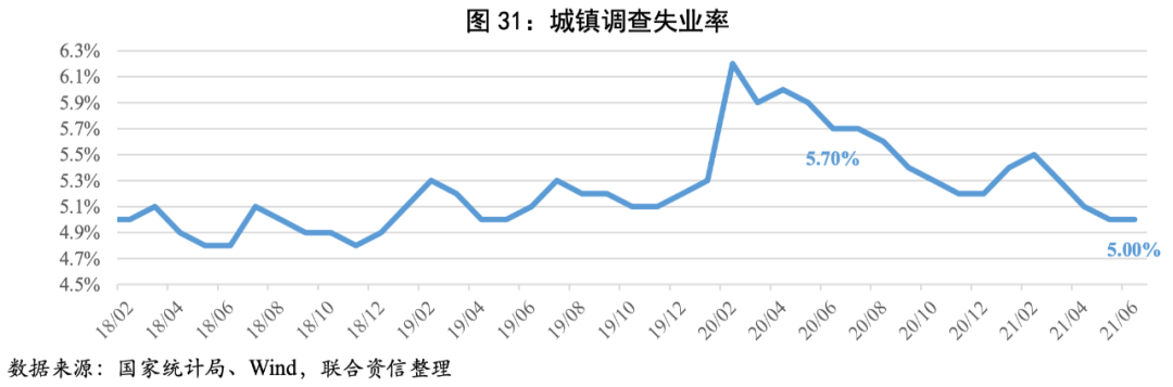 2021年上半年就業形勢總體不斷改善。一季度受春節因素和部分地區散發疫情的影響,各月調查失業率相對較高,二季度勞動力市場繼續回暖,企業用工需求增加,調查失業率連續下降至6月的5.00%,低于上年同期0.70個百分點。上半年全國城鎮調查失業率均值為5.20%,低于5.50%左右的政府預期目標。