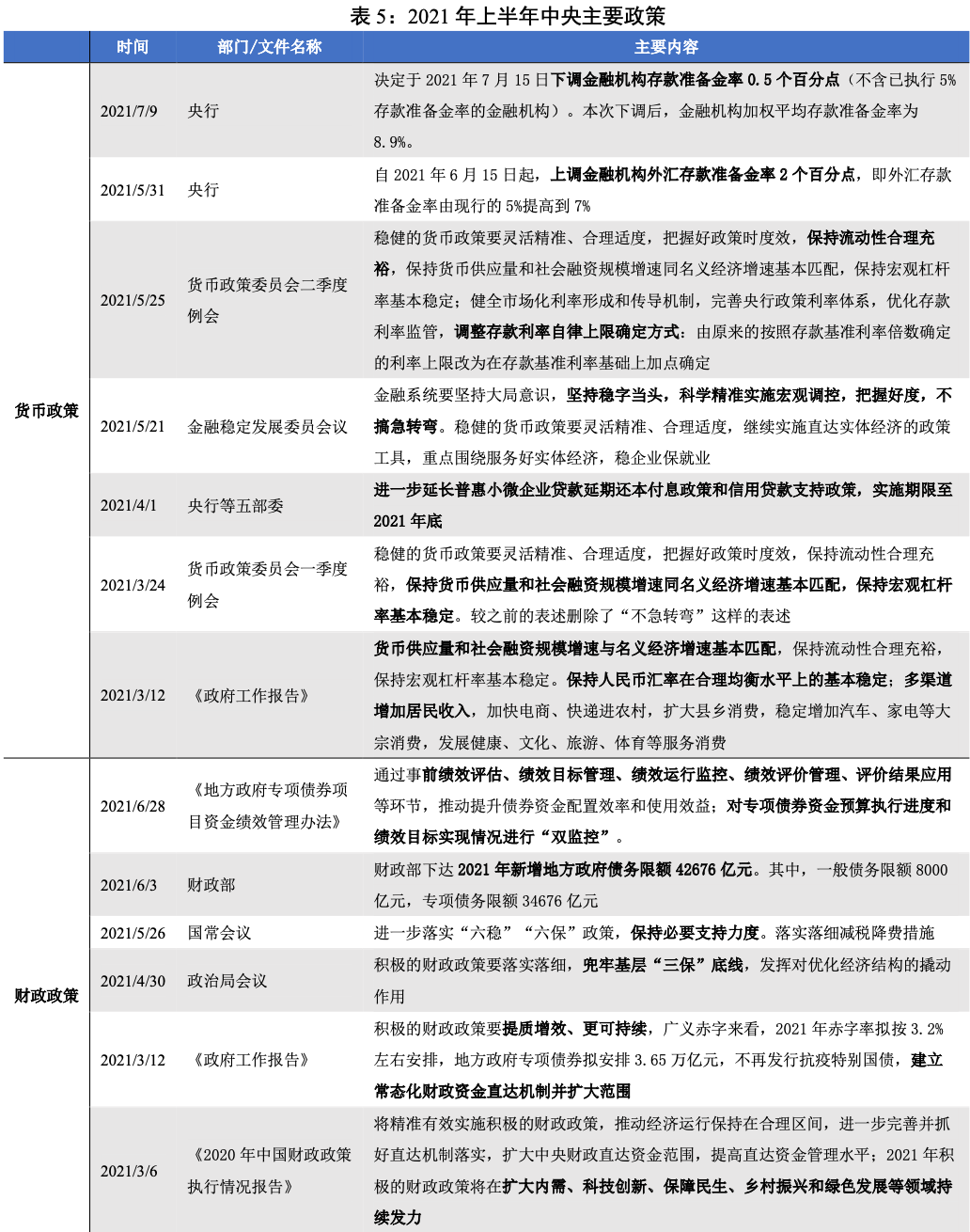 ·2021年以來,積極的財政政策突出強化“提質增效、更可持續”;對專項債券資金預算執行進度和績效目標實現情況進行“雙監控”。下半年貨幣政策還是以“穩”為主,匯率將繼續“保持人民幣匯率在合理水平上波動”的目標。