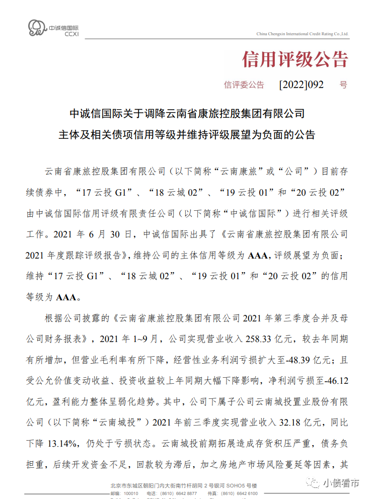 近日,中誠信國際公告稱,將云南省康旅控股集團有限公司(以下簡稱“云南康旅”)主體信用等級由AAA調降至AA+,維持評級展望為負面;將“17云投G1”、“18云城02”、“19云投01”和“20云投02”的債項信用等級由AAA調降至AA+。