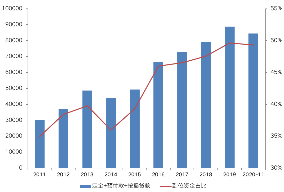 在房企項(xiàng)目開發(fā)過程中,銷售回款最重要的資金來源。自2014年以來,銷售回款逐年上升,在房地產(chǎn)開發(fā)到位資金的比重也不斷擴(kuò)大,增速明顯高于其他融資渠道。2020年11月,定金、預(yù)收款和個(gè)人按揭貸款合計(jì)占資金總額的比重為49.3%,基本占據(jù)半壁江山。