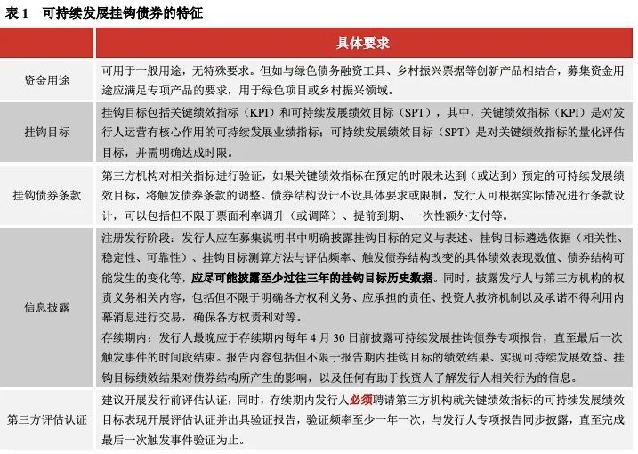 可持續發展掛鉤債券在信息披露、第三方評估認證方面與綠色債券有些許類似。可持續發展掛鉤債券要求每年披露可持續發展相關專項報告,綠色債券要求每半年披露綠色相關專項報告。可持續發展掛鉤債券對第三方評估認證的態度是:建議進行發行前評估認證,必須進行存續期評估認證;綠色債券對第三方評估認證的態度是鼓勵。