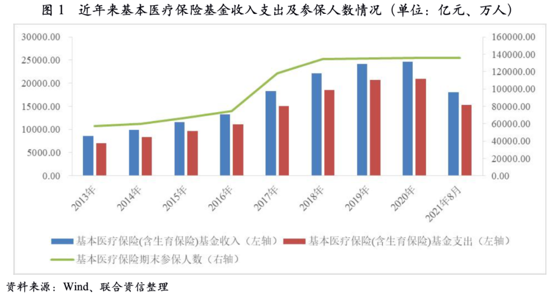 從醫(yī)藥行業(yè)下游支付能力來(lái)看,醫(yī)保基金作為最重要的支付方,其支付額約占整體醫(yī)療衛(wèi)生總費(fèi)用的約40%,醫(yī)保基金的支付能力直接決定了醫(yī)藥行業(yè)的回款情況。根據(jù)國(guó)家醫(yī)保局?jǐn)?shù)據(jù)顯示,2020年,全國(guó)基本醫(yī)保基金(含生育保險(xiǎn))總收入為2.46萬(wàn)億元,同比增長(zhǎng)0.08%;全國(guó)基本醫(yī)保基金(含生育保險(xiǎn))總支出為2.09萬(wàn)億元,同比變化不大,年末醫(yī)保基金累計(jì)結(jié)余3.14萬(wàn)億元。2021年1-10月,全國(guó)基本醫(yī)保基金(含生育保險(xiǎn))總收入為2.46萬(wàn)億元,全國(guó)基本醫(yī)保基金(含生育保險(xiǎn))總支出為1.90萬(wàn)億元。