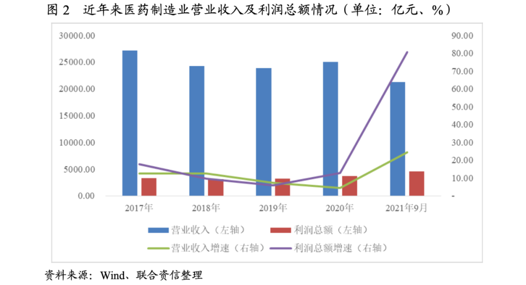 2020年,受新冠肺炎疫情影響,各層級(jí)醫(yī)療機(jī)構(gòu)日常診療活動(dòng)減少,藥品終端銷(xiāo)售市場(chǎng)規(guī)模近年來(lái)首次出現(xiàn)負(fù)增長(zhǎng),但隨著人均可支配收入增長(zhǎng)、人口老齡化趨勢(shì)逐年加重以及醫(yī)保收入和參保人數(shù)增加,中國(guó)醫(yī)藥需求仍保持穩(wěn)健。2021年以來(lái),醫(yī)藥行業(yè)盈利水平逐漸從新冠肺炎疫情的影響中恢復(fù),醫(yī)藥制造業(yè)企業(yè)營(yíng)業(yè)收入和利潤(rùn)總額均大幅增長(zhǎng);同時(shí)持續(xù)加強(qiáng)創(chuàng)新研發(fā)投入,行業(yè)內(nèi)企業(yè)獲現(xiàn)能力持續(xù)提升,杠桿水平處于合理水平。