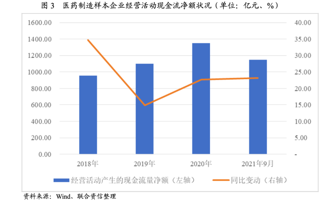 獲現(xiàn)能力方面,2021年1-9月,醫(yī)藥制造樣本企業(yè)經(jīng)營(yíng)活動(dòng)產(chǎn)生的現(xiàn)金流量?jī)纛~為1149.54億元,較上年同期增長(zhǎng)23.20%,延續(xù)了2018年以來(lái)現(xiàn)金流持續(xù)優(yōu)化的行業(yè)發(fā)展趨勢(shì)。