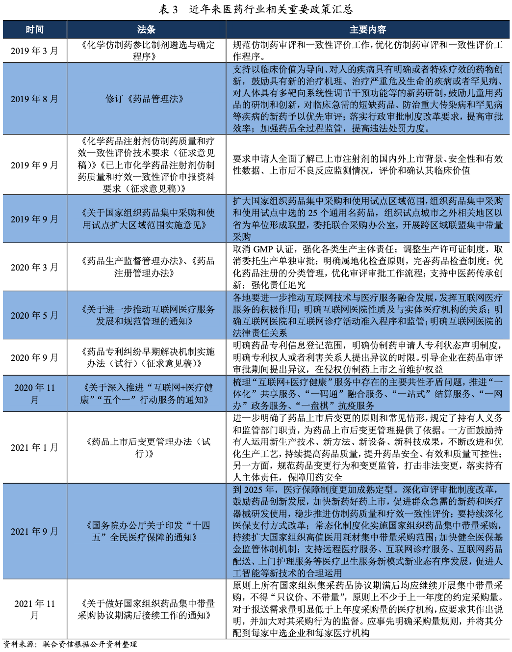 2019年以來(lái),集中帶量采購(gòu)、醫(yī)保控費(fèi)等政策的持續(xù)推進(jìn)為醫(yī)藥行業(yè)帶來(lái)了深刻變革;與此同時(shí),藥品審評(píng)審批、專(zhuān)利糾紛早期解決等政策的不斷完善也為醫(yī)藥行業(yè)帶來(lái)了新的機(jī)遇。2020年新冠疫情催生“互聯(lián)網(wǎng)+醫(yī)療”的蓬勃發(fā)展,相關(guān)規(guī)范化政策的陸續(xù)出臺(tái)為“互聯(lián)網(wǎng)+醫(yī)療”的可持續(xù)發(fā)展保駕護(hù)航。2021年“十四五”規(guī)劃發(fā)布,進(jìn)一步明確醫(yī)藥行業(yè)發(fā)展方向,各項(xiàng)政策持續(xù)推進(jìn)。