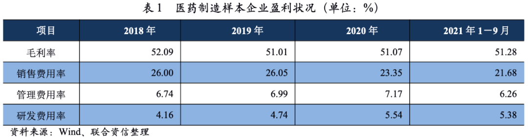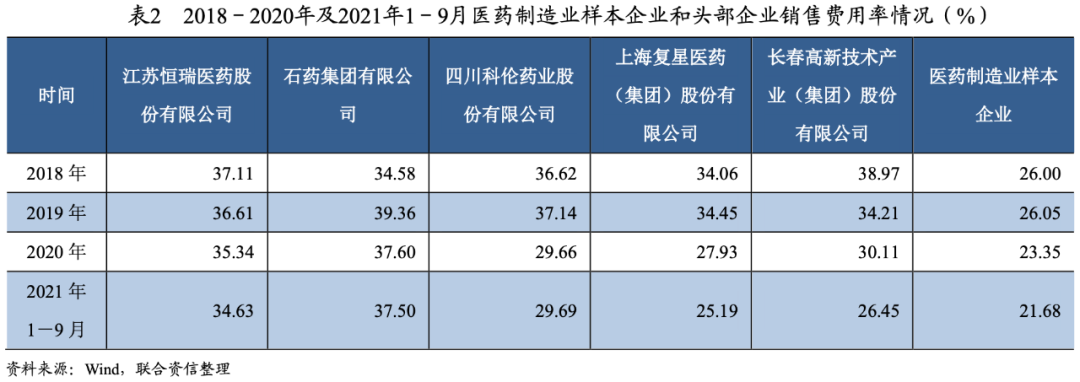 從醫(yī)藥制造業(yè)樣本數(shù)據(jù)分析[2]來(lái)看,2018-2020年,醫(yī)藥制造樣本企業(yè)銷(xiāo)售費(fèi)用率分別為26.00%、26.05%和23.35%,波動(dòng)下降,但處于較高水平。2021年1-9月,醫(yī)藥制造樣本企業(yè)銷(xiāo)售費(fèi)用率為21.68%,較上年同期下降1.40個(gè)百分點(diǎn)。2018-2020年,頭部企業(yè)銷(xiāo)售費(fèi)用率均大于27.00%,處于較高水平,對(duì)利潤(rùn)水平存在一定影響。