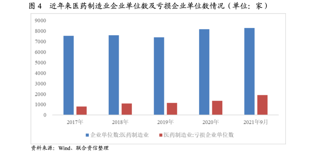 從行業(yè)主體數(shù)量來(lái)看,截至2020年底,醫(yī)藥制造業(yè)企業(yè)單位為8170家,較上年底增加778家;虧損企業(yè)1344家,較上年底增加193家。截至2021年9月底,醫(yī)藥制造業(yè)企業(yè)單位為8282家,較上年底增加112家;虧損企業(yè)1886家,較上年底增加542家。2020年以來(lái),醫(yī)藥制造業(yè)企業(yè)數(shù)量增加較快,但虧損企業(yè)占比亦逐年上升,行業(yè)內(nèi)分化程度加深。