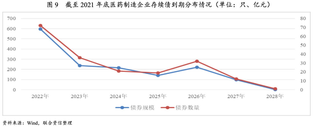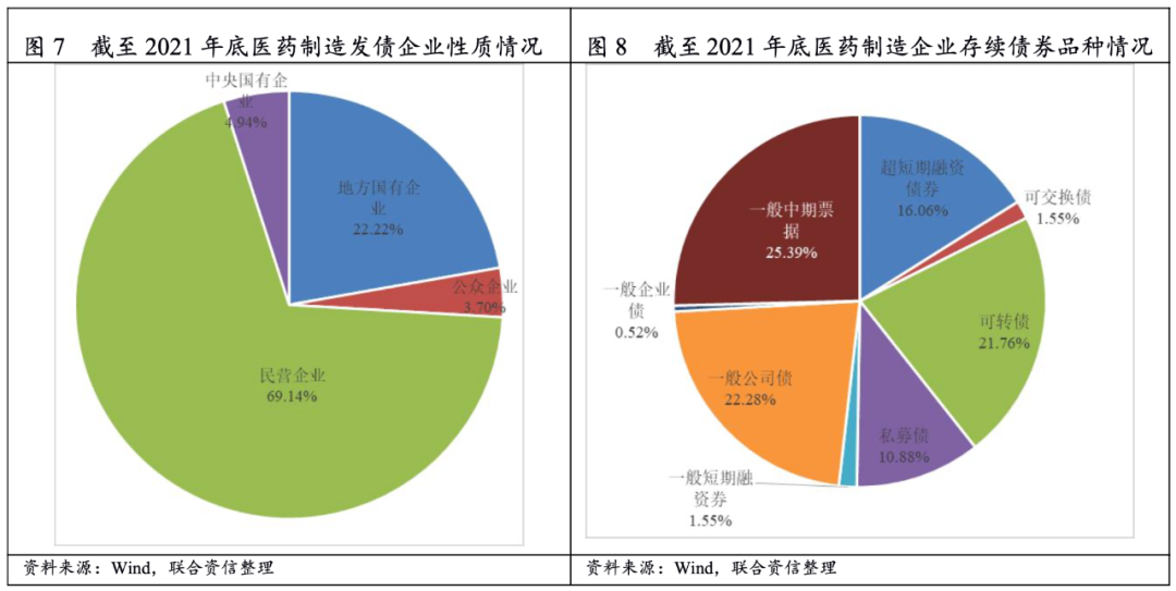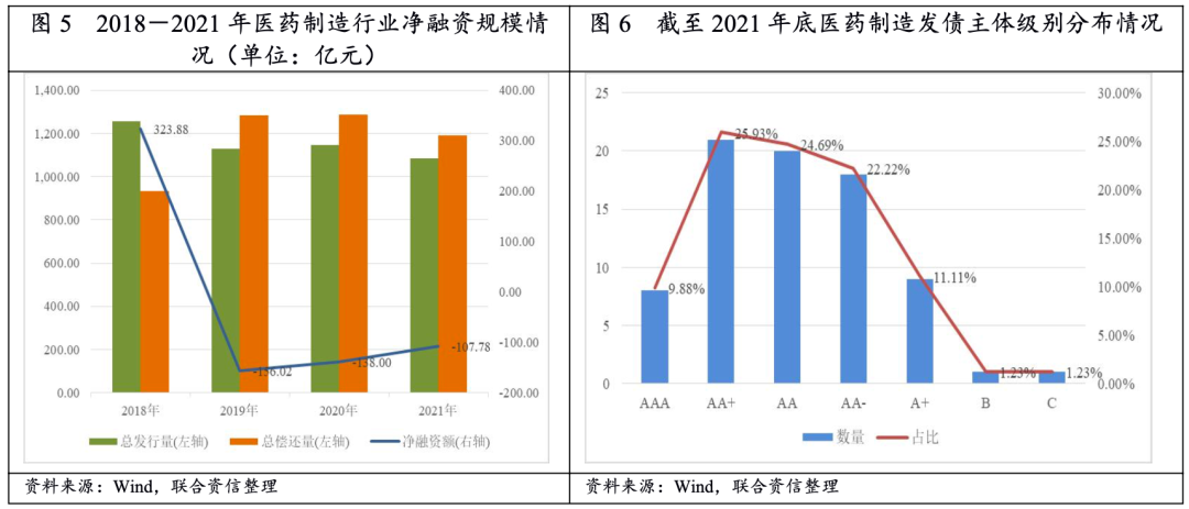 行業(yè)債務(wù)負(fù)擔(dān)加重,2021年醫(yī)藥制造行業(yè)債券到期規(guī)模較大,凈融資規(guī)模呈凈流出狀態(tài)。行業(yè)內(nèi)發(fā)債企業(yè)主要集中于AA+級(jí)別民營(yíng)企業(yè)。