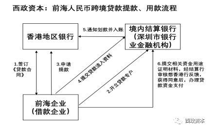 前??缇橙嗣駧刨J款系指在前海注冊成立并在前海實際經(jīng)營或投資的企業(yè)從香港經(jīng)營人民幣業(yè)務(wù)的銀行借入人民幣資金的業(yè)務(wù)。資金用途上不得用于投資有價證券和金融衍生品,不得用于委托貸款,不得用于購買理財產(chǎn)品,不得用于購買非自用房產(chǎn)等。其基本流程如下: