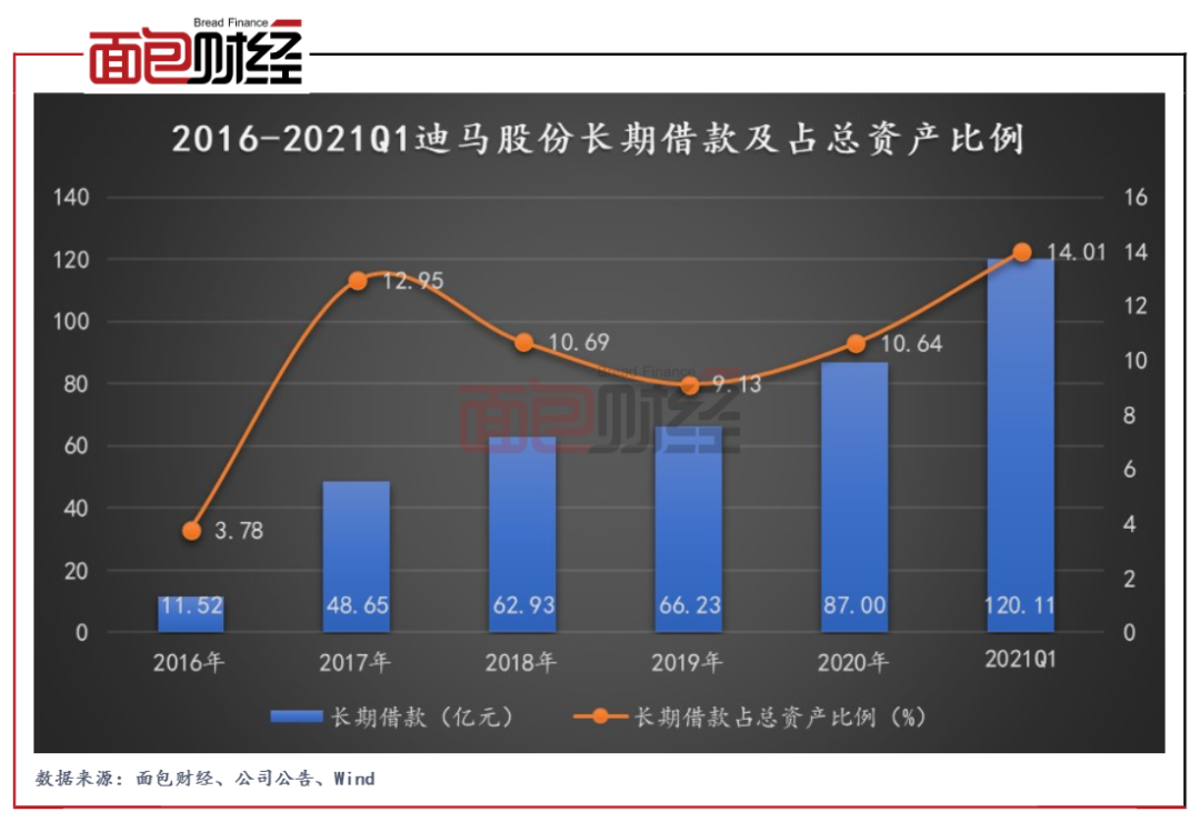 圖2:2016-2021Q1迪馬股份長(zhǎng)期借款及占總資產(chǎn)比例