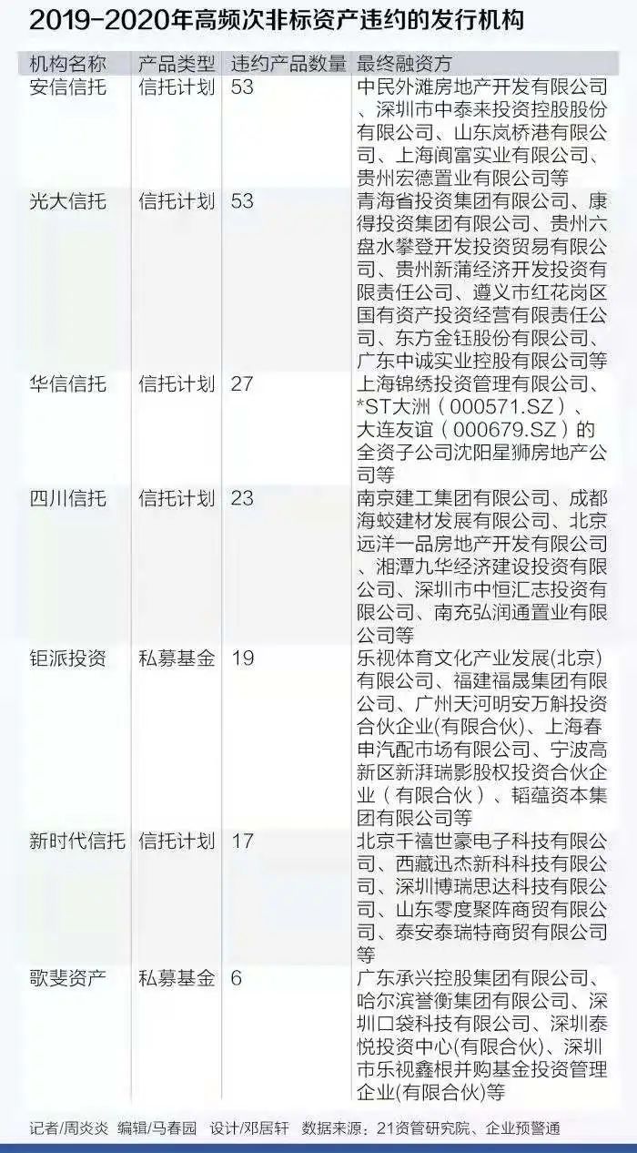 從21世紀資管研究院的數據顯示,2019-2020期間一共發生過的非標違約債項,僅從公開數據統計顯示就有超2200條之多。涉及信托計劃、券商集合、私募基金、期貨資管、銀行非保本理財和保險資管,波及的資管機構高達上百家。